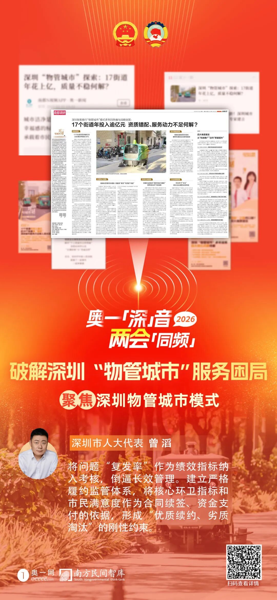 🖝 奥一关注“垃圾清运不及时”“作业水花喷溅行人”“环卫车被指违规取水”等困扰市民的具体现象,推出多起相关报道,并深度调研深圳“物管城市管理模式”。今年两会,深圳市人大代表曾滔在奥一采访中提出的相关建议直指改革难题,给出了积极响应与清晰的破题思路。
