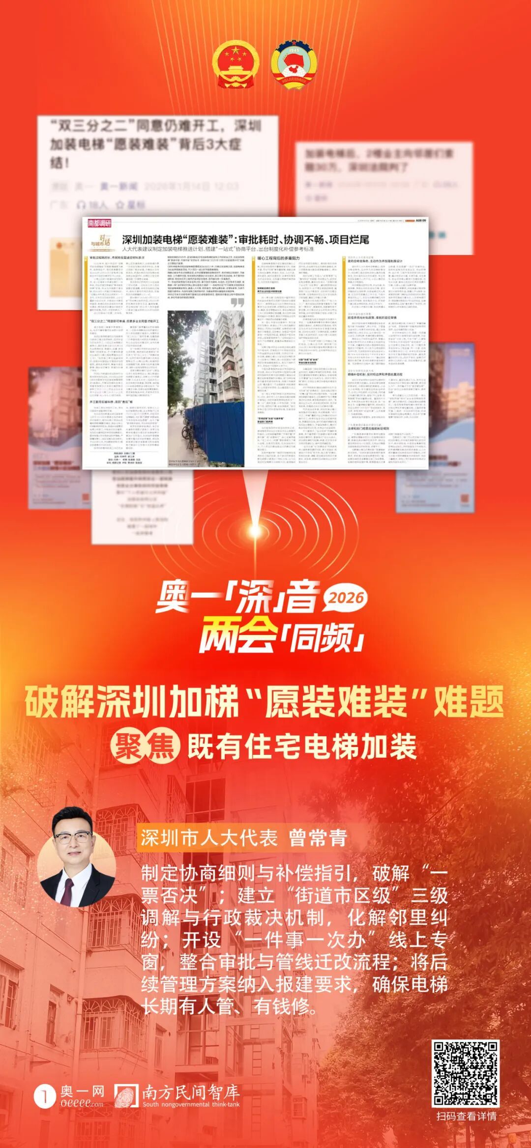 🖝 近年来老旧小区加装电梯成为深圳市民热议的话题,奥一新闻长期关注该民生问题推出多期报道,并进行多轮走访与深度调研。今年两会,“加梯”这一民生话题又再次被提及,深圳市人大代表曾常青提交相关建议。