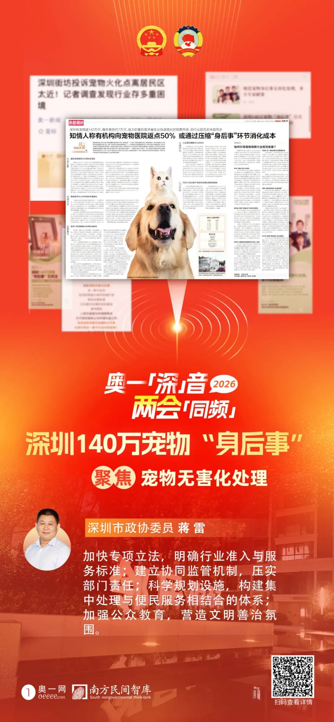 🖝 去年年底,南都·奥一新闻走好新时代网上群众路线大调研与城市对话栏目聚焦宠物无害化处理的流程与监管空白,推出重磅报道,引发热议。今年两会,深圳市政协委员蒋雷提交的《关于规范深圳市宠物殡葬行业管理完善宠物遗体无害化处理体系的提案》,与奥一共同聚焦这一议题。
